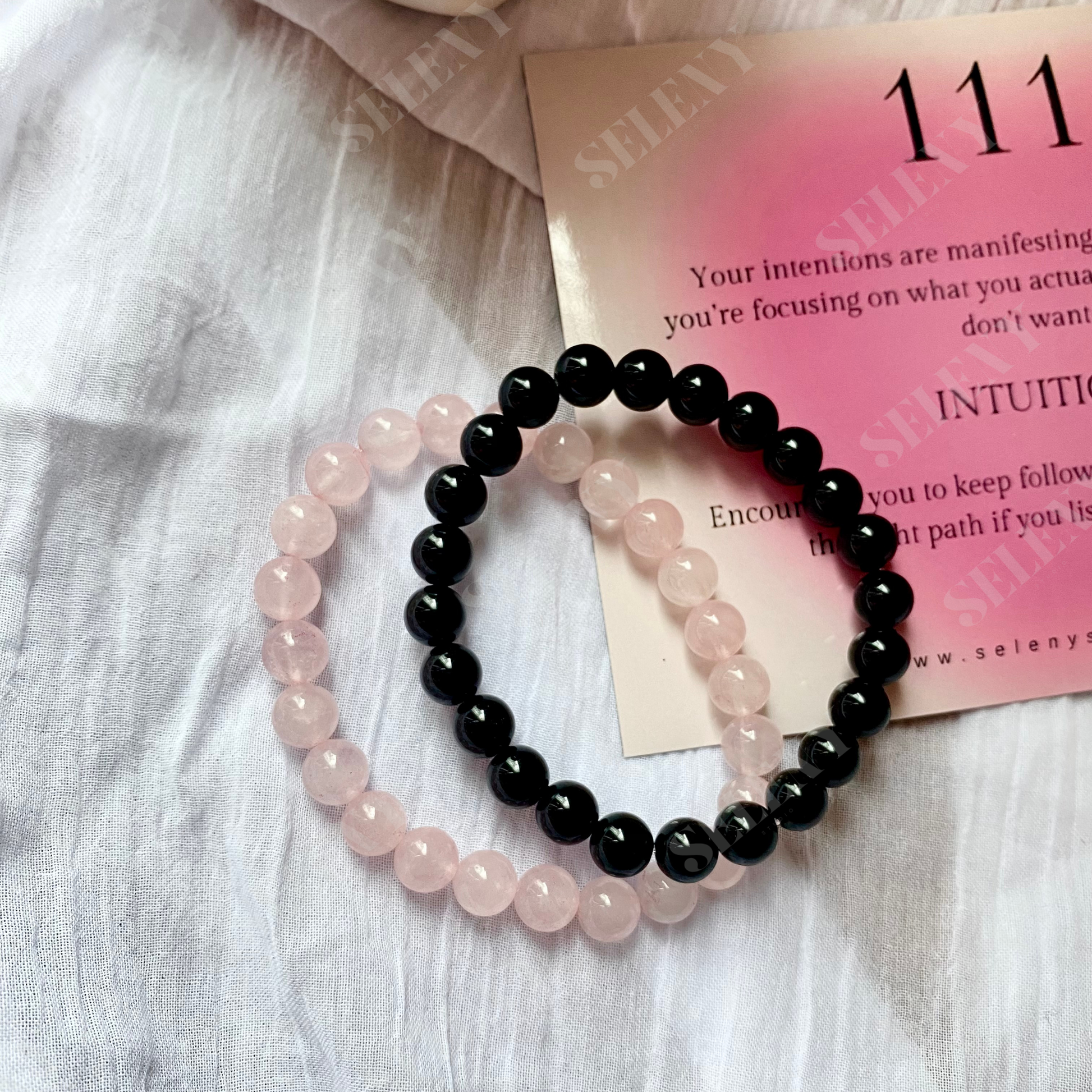 A beautifully crafted set of two bracelets, combining the calming energy of Rose Quartz and the protective power of Black Onyx
